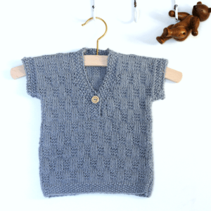 Ferro delle asole: un diritto, un rovescio,*un gettato, due assieme al dritto, lavorare 12 (13, 13,12) maglie secondo il motivo, ripetere da*per due (due, 2,3) altre volte, un gettato due assieme al dritto, lavorare fino alla fine del ferro. Lavorare un ferro a p riso poi chiudere le maglie lavorando a p Riso.