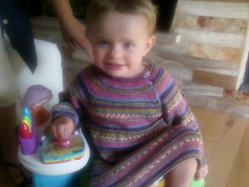 Non l’avevo ancora lavorata e così me la sono riportata a Londra in quest’ultima occasione ( sapete che noi drogate non ci facciamo mancare nulla..): hai visto mai ,ho pensato, che comincio un lavoro e poi non mi basta la lana.. e infatti ho iniziato un cardigan per Flavia(ça va sans dire..) e poi me ne è avanzata ancora per uno scamiciatino da abbinarci.