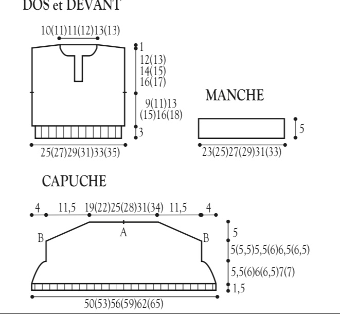 Le 23 m centrali solo il dietro dello scollo le altre le spalle. Davanti Lav come il dietro fino a 19/20/21 cm mettere la m centrale su una spilla e proseguire sulle due parti separatamente con due gom diminuendo 1 m ai lati della m centrale ogni due ferri per 6 volte a 1 m dal centro ( all’interno di una m: a destra un’accavallata e a sin due ass)e per il raglan dim 1 m ogni 4 ferri per 5 volte. A 33/35/37 cm dall’inizio chiudere le restanti 10/11/12 maglie ai lati per le spalle. FINITURE Stirare al vapore Se lav il bordo dello scollo in tondo cucite le spalle e i fianchi.