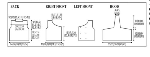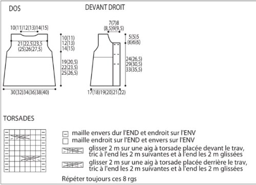 –A 15 (17.5) 20 (22.5) 25 (27.5) cm per lo scollo dim a ds a 3 m dal bordo 1 volta 2 m, poi ogni 2 ferri 6 volte 2 m e 3 (4) 5 (6) 7 (8) volte 1 m.