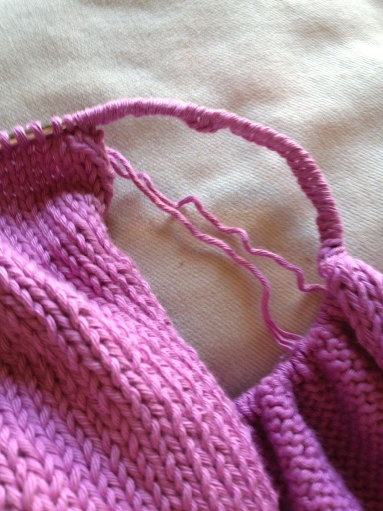 Al dir del lav riprendere 44 m attorno allo scalfo dividere le m su 3 f a doppie punte( ma se le riprendete prima di aver unito le parti finali potete usate i ferri diritti)