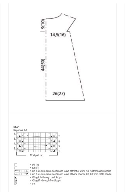 Giro succ: Montare 46[52] m per la manica, lav 63[67] m per il davanti, montare 46[52] m per l’altra manica, lav 63[67] m per il dietro = 218[238] m