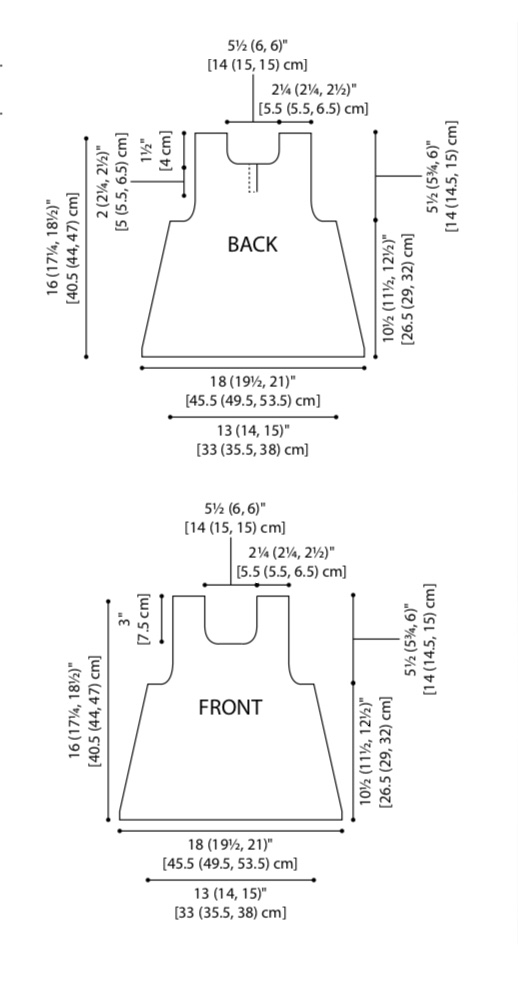 Finished Chest: 26 (28, 30)” [66 (71, 76) cm]