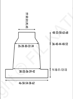 Diminuzioni – Diminuire una maglia ai lati dei markers (quattro maglie diminuite in totale) al giro successivo, poi ogni 30 (30-32-34-38) giri.avremo 136 (144-152-160-168) m.