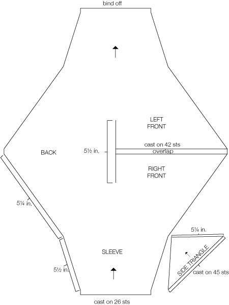 Begin Garter st and shape sleeve by inc 1 st at beginning and end of every 16th (8th, 10th) row 2 (5, 5) times–26 (38, 40) sts.