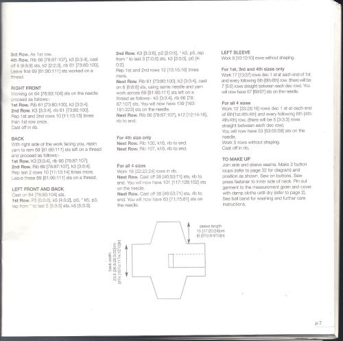 Montare 30m(34-34) lav 2cm di coste poi continuare a m rasata distribuendo 2 aumenti(nessuno per la seconda mis, e 2 per la terza mis). sul primo ferro e aumentando ai lati: ogni 4 ferri 6 volte 1m(ogni 5 ferri7v 1m,ogni 5 f 8 v 1m)= 44m(48-52).