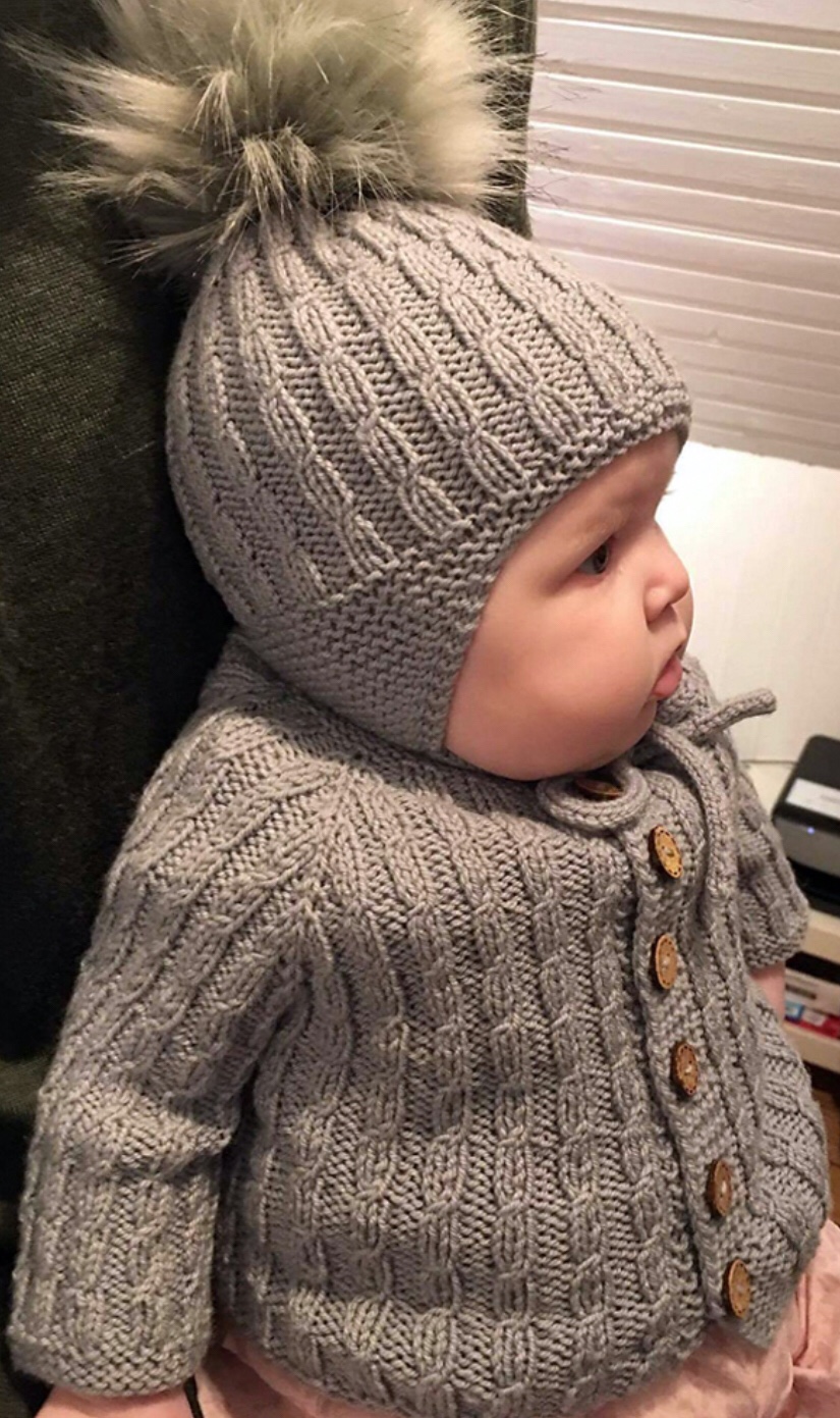 Pick up and knit 53 (57) 61 (71) 75 stitches along the right side of the cardigan’s right front with size 3.0mm needles. Knit k1, p1 ribbing for 2 (2) 4 (4) 4 rows. Bind off. Do the same along the side of the back and the right sleeve.