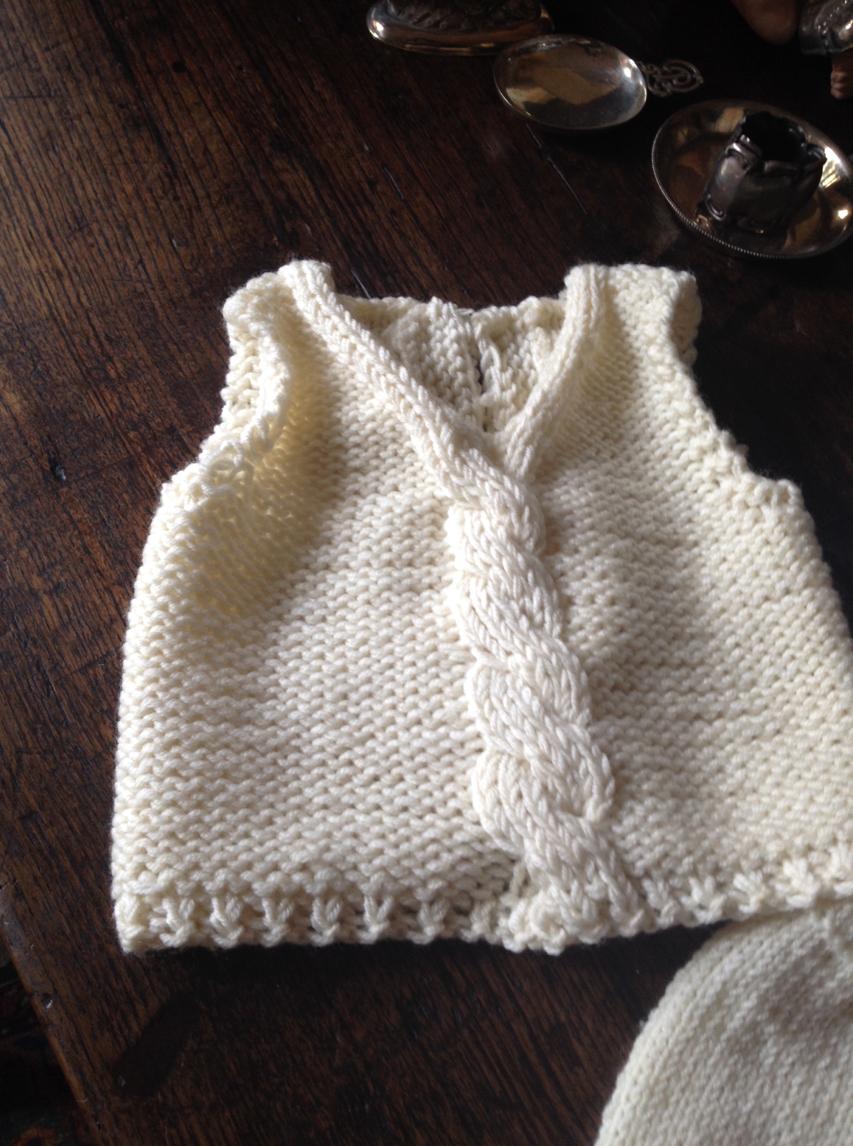 Con i ferri 3 montare 6m,lav a legaccio fino a che tirando un poco, il pezzo raggiungerà la lunghezza di un bordo dell’apertura del dietro e cucirlo in posizione mano mano che lo si lavora .(io riprendo al dir del lav le m, lungo i bordi con i ferri 3, riprendendo 3m ogni 4, lavoro a legaccio altri 4 ferri poi chiudo al ferro succ sul rov del lav lavorando dir: nel bordo delle asole al secondo ferro dopo che si sono riprese le m, sul dir del lav quindi ,dal bordo sin, faccio le asole, lav 1 gett,2ass al dir, e faccio la prima a 2 /3 m dall’alto ,le altre a uguale distanza, poi lav altri 2 ferri e chiudo).)