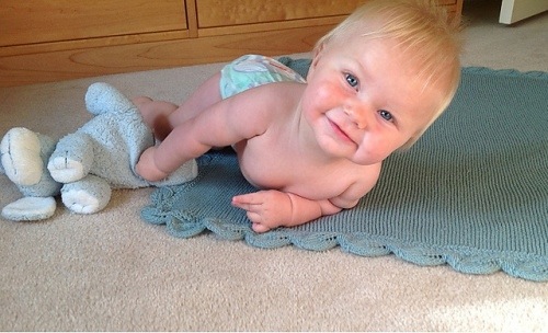 Poi lav 4 ferri grigio, 12 bianco, cont con il col azzurro,diminuendo 2-1-1 1 m. al primo ferro