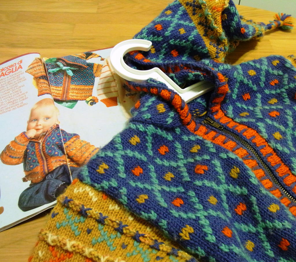 Non so per quale perversione maglieristica ma l’originale dice che per le prima 3 misure dovete fare il dietro in tinta unita e le maniche a righe e per le altre misure al contrario, io vi dico…fate come meglio vi ispira e a seconda della lana che avete..