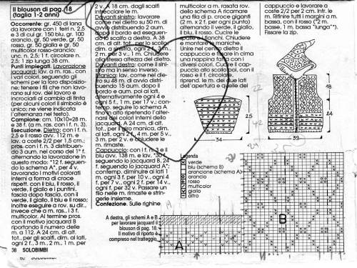 Con il colore scelto montare 24m(26-26-28-30) e lav 2 ferri diritti,continuare poi a m rasata ,per le prime 3 misure. lavorare 4 ferri a righe per 2,5cm, mentre per le altre misure lav a m rasata senza le righe(ma..!?) per 2,5 cm,, continuare a righe per le prime 3 misure e in colore unito per le altre e contemporaneamente aumentare 1 m ai lati del ferro ad ogni ferro diritto per 5 volte(5-5-2-2),quindi ogni 4 ferri per 6 volte(4-3-2-3),poi ogni 6 ferri per zero volte(2-4-7-7)=46m(48-50-50-54).