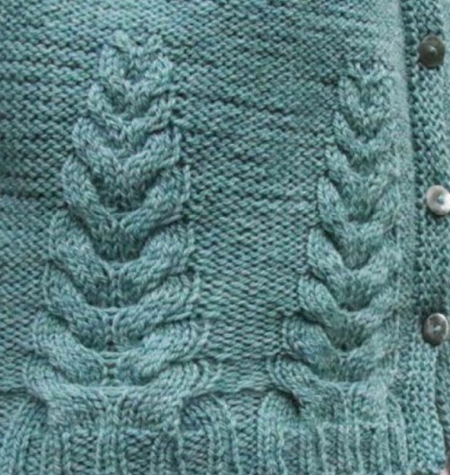 Ripetere gli ultimi due ferri altre due volte, resteranno cinque maglie. Ferro successivo: due assieme ritorte, un diritto, due assieme al dritto.