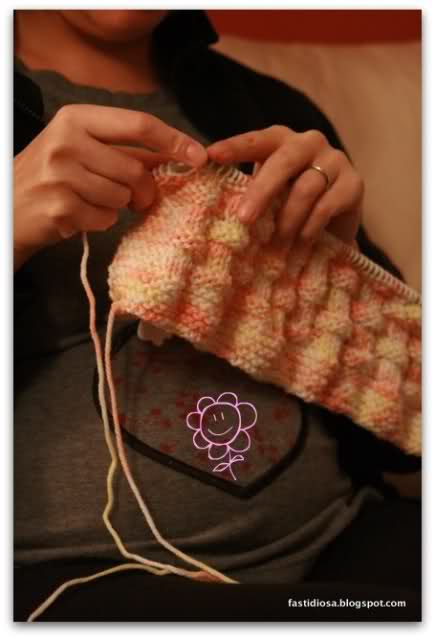 Si parte dal 1/2 dietro sinistro montando 75 m (ferri 2,5) e ,dopo aver fatto un bordo di 8 f (fare 5 asole al 4* f), si parte facendo 3 steps che servono per fare lo sprone ,e che dureranno per tutta la lavorazione: