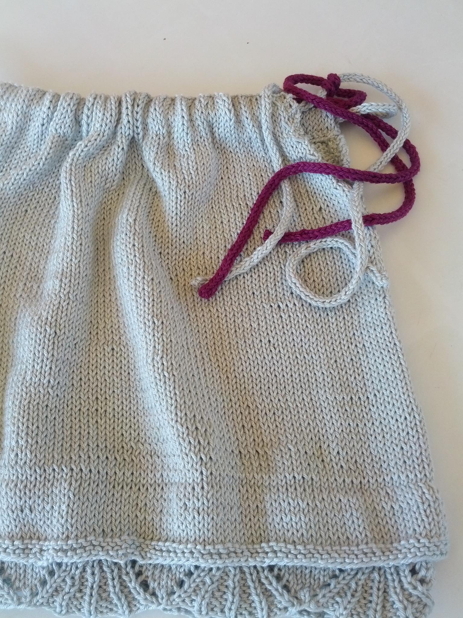 Si riperendono le m ai bordi dei davanti, si lavora no a legaccio, sul davamti destro si sono fatte 3 asole al terzo ferro, poi altri 2 ferri di legaccio e al terzo ferro sul rov del lavoro, si chiudono le m lavorando diritto.
