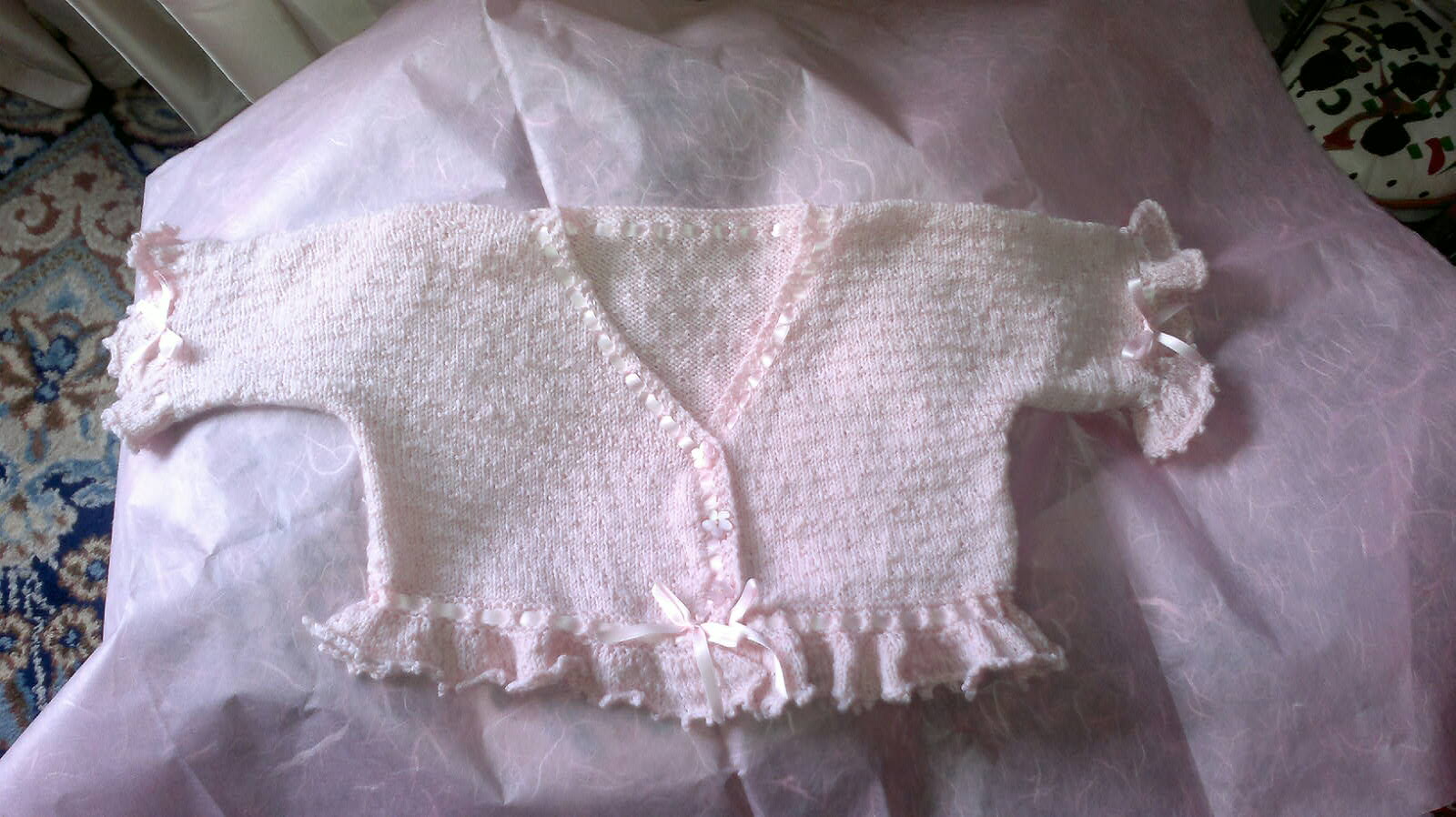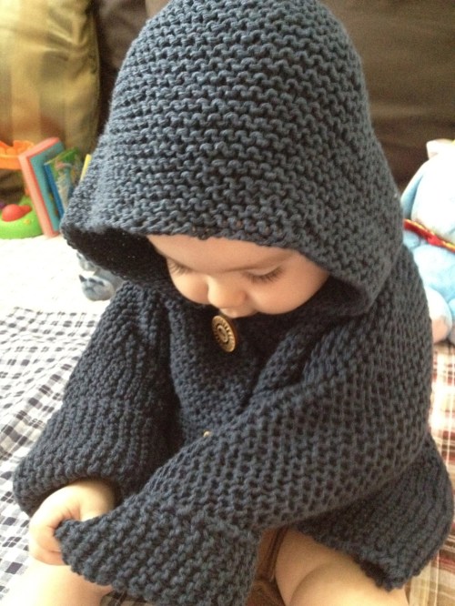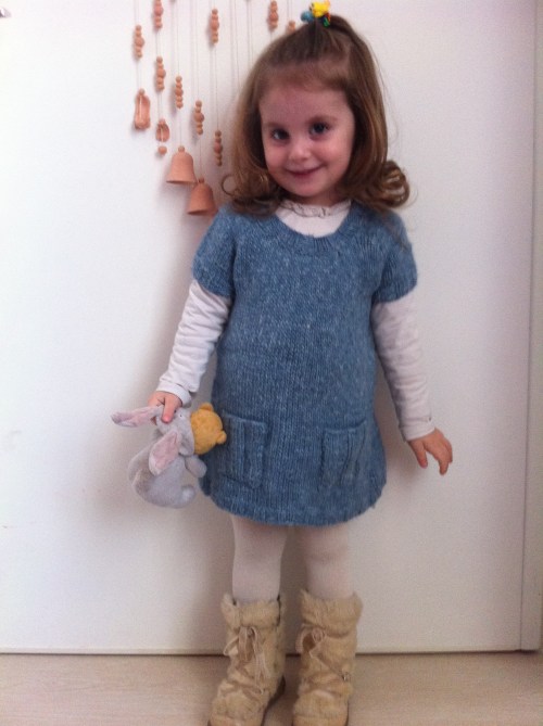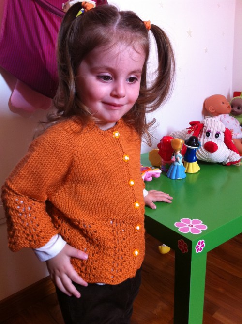 Anche Federica , che ha appena finito il suo primo corso(2 cardigan e un berretto finiti e un altro in cantiere..) mi ha mandato le foto dei suoi lavori indossati da Emma San e un amichetto: