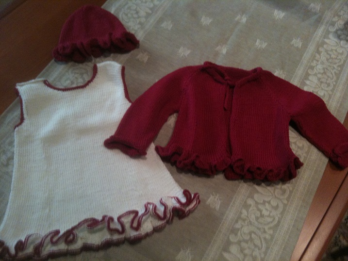 “Ciao Marica, e’ passato un bel po’ di tempo da quando ti avevo detto che ti avrei mandato l’ultimo golfino fatto per Sofia . Ora finalmente ho trovato il tempo di girarti una foto del mio piccolo “capolavoro” , mi riferisco alla bimba xche’ il golfino non e’ nulla di che, molto semplice, sono agli inizi, questo e’ il secondo golfino che faccio per la mia bimba, dovevo abbinarlo al vestitino che indossa e che le ho fatto per natale. Quest’inverno mi sono lanciata prima con il vestitino, poi il golfino e per finire il cerchietto. Volevo fosse tutto coordinato. Sono un po’ fissata ! Ad oggi le ho realizzato un giacchino in cotone, tutto a legaccio in più colori, un mini Chanel, con tanto di frangine sul davanti e sui polsi, ma come la tua piccola Flavia, questo golfino a Sofia non piace, mi ha detto addirittura a chi regalarlo. Ti rendi conto , ed ha appena compiuto 3 anni !