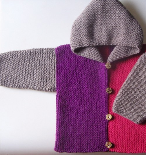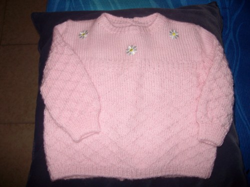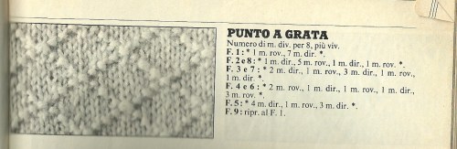 Scrive la lettrice:”Rispetto al modello originale, da brava pigrona, ho eliminato tutte le cuciture e ho ripreso tutte le maglie del davanti del dietro su un unico ferro. Anziché i bottoni ho messo due cordoncini. ho usato circa 150 gr (circa 280 mt) di lana Mondial qualità Levante e i ferri 3,5-