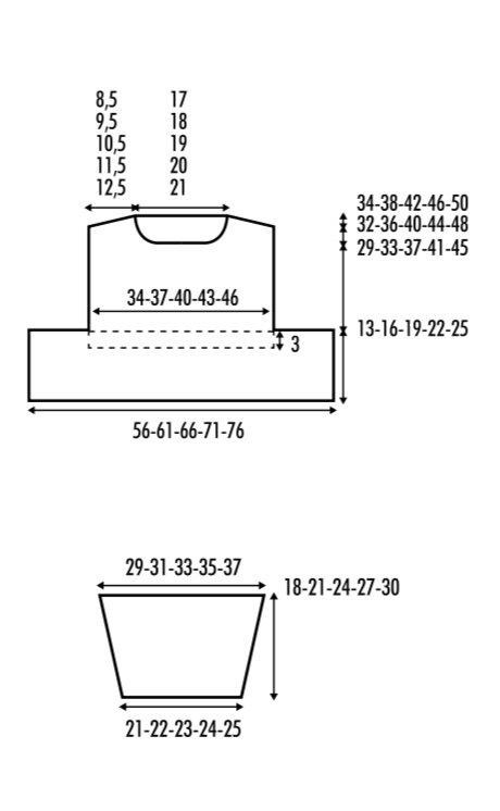 Si lavora iniziando dal basso con il bordo a p chevron in un unico pezzo in tondo fino alla base del giromanica dove il lavoro si divide tra davanti e dietro . Le spalle si modellano facendo dei ferri accorciati.