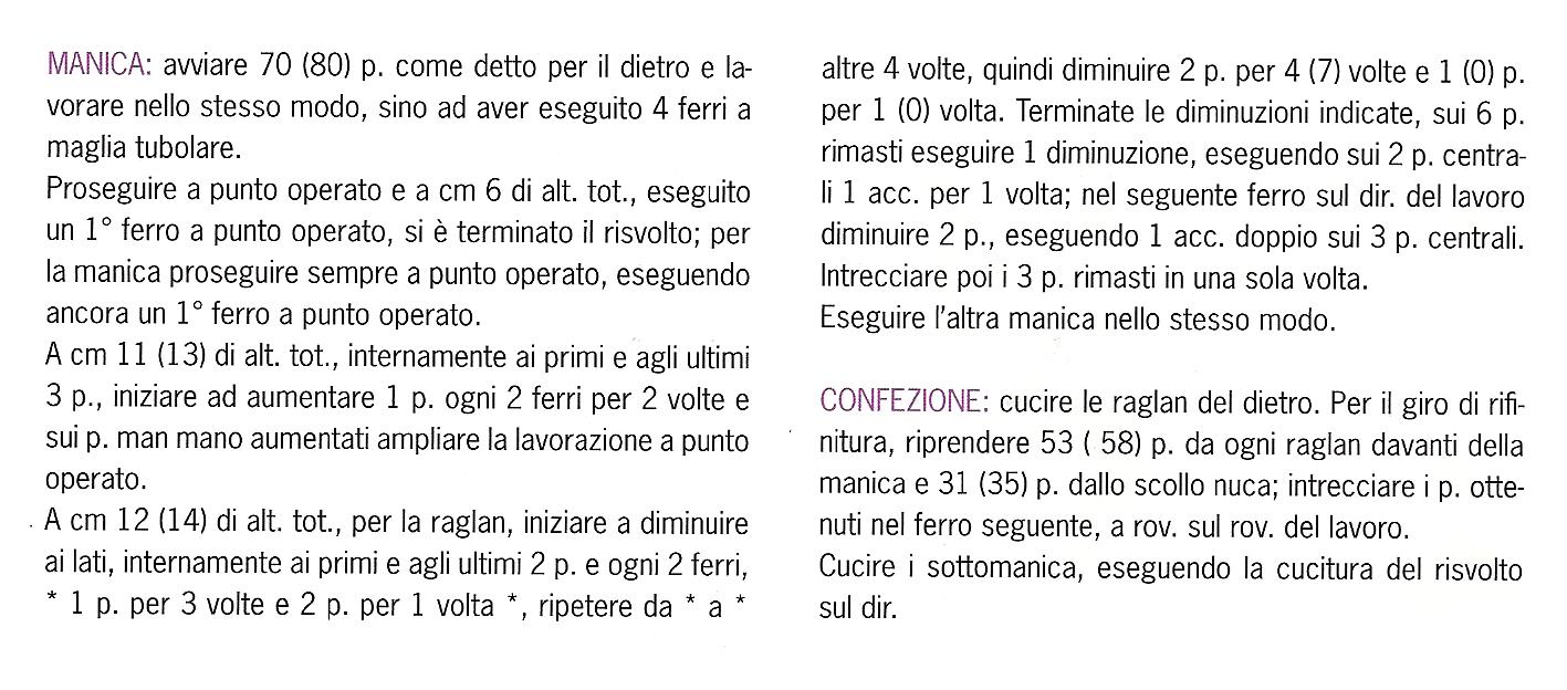 stesso lavoro del dietro e a 9cm(10-11) chiudere ai lati 2 volte 4m poi dim a 2m dai bordi ogni 2 ferri,8(8-12)volte 1m, poi ogni 4 ferri,3 volte(4-2) 1m.