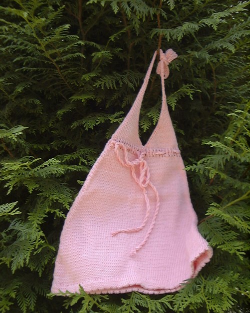 Non chiudere le m faremo i laccetti per fermare l’abito dietro il collo,potete continuare lavorando a m rasata sulle m rimaste fino alla lunghezza desiderata, oppure fare un i-cord con 2 ferri a doppie punte.