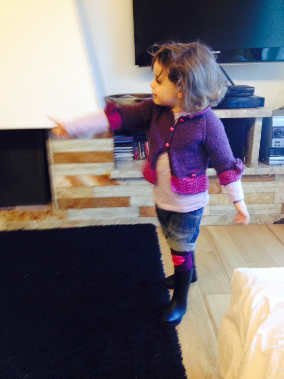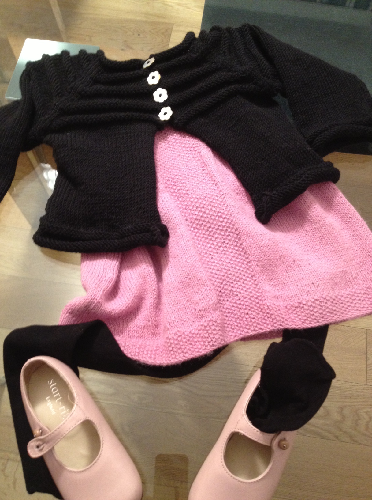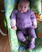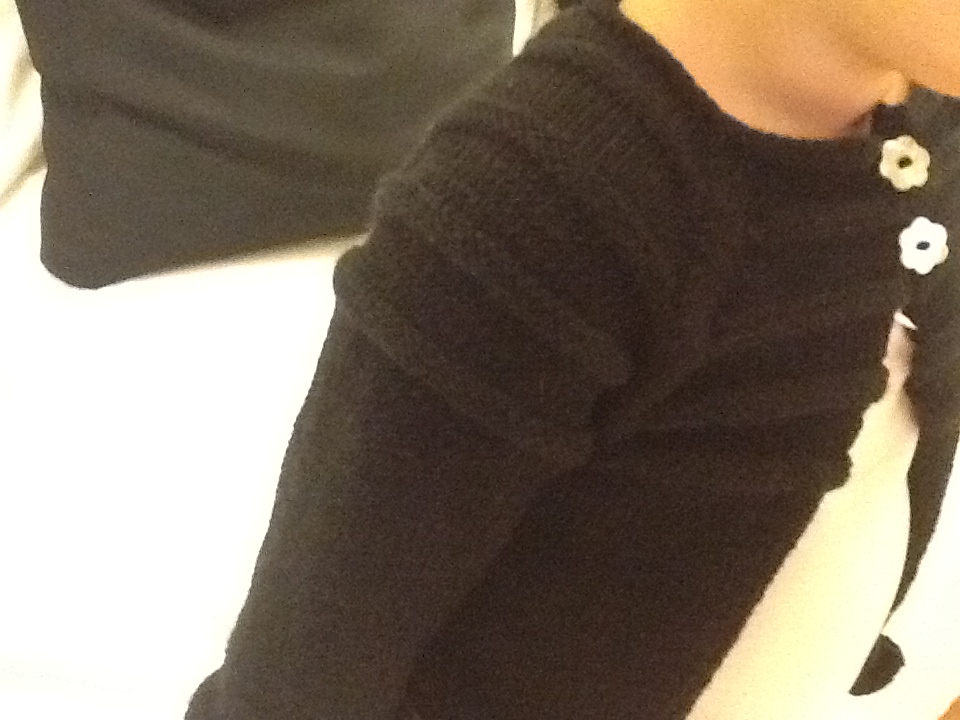 Maniche 3/4:ho rimesso sui ferri le m delle maniche e le ho lavorate contemporaneamente con due gom per 20 cm diminuendo una m ai lati per 2 volte poi 4 ferri a legaccio e infine il volant: su un multiplo di 11 m +1 m ai lati per la cucitura: