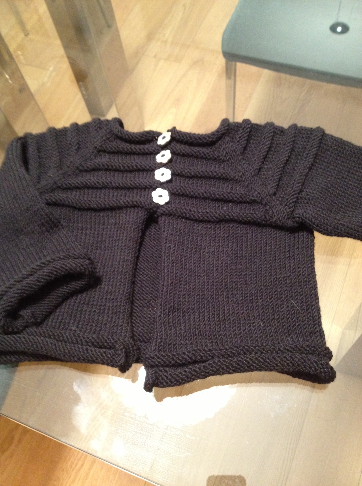 Ma la vera sciccheria sta nel bordo in fondo: dopo avere messo in attesa le maniche, ho lavorato a m rasata fino a 18 ferri prima della vita , ho fatto 4 ferri a legaccio e nell’ultimo ferro ho aumentato circa 20 m lungo il ferro , se lo volete più