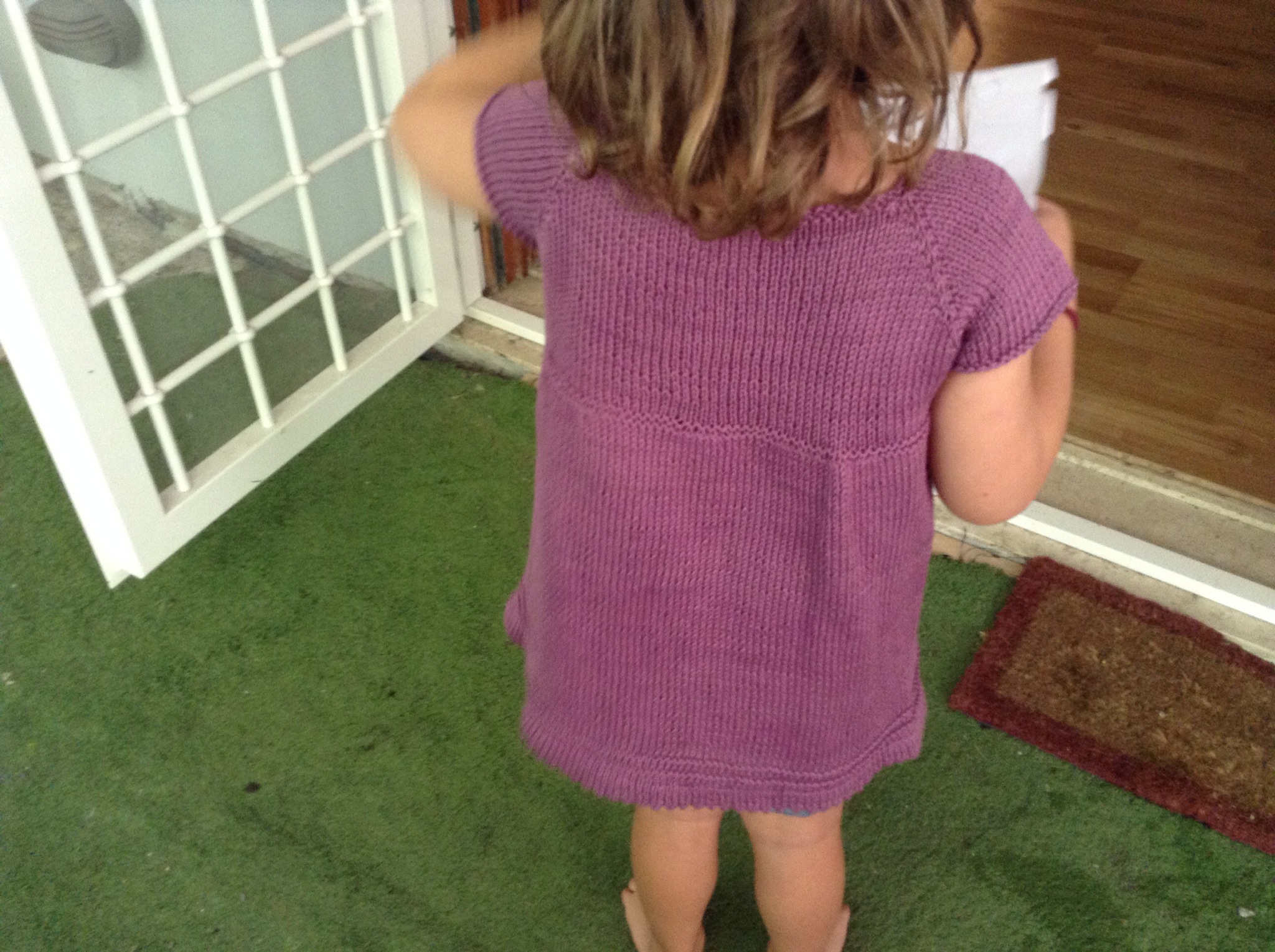 Si lavora a coste 2/2, cominciando e finendo il ferro con 3 dir; le maniche e il dietro si lavorano iniziando con 2 diritti dopo i gettati;al rovescio, quando lavorerete i gettati , dovrete lavorarli al dir o al rovescio, per completare il motivo delle coste.(ricordate di lavorare a m rasata le 2m trai gettati:dr sul dir rov sul rov, non fanno parte della lavorazione a coste) Un esempio: per Flavia ho montato per il davanti 5 m e poi il segno, per cui ho lavorato così:per il davanti sinistro:1 dir, 1 aum intercalare,1 dir,2 rov,1 gettato,1 diritto( e sono arrivata al segnapunto, sposto il segnapunto a destra, per la manica sinistra:1 altro diritto, 1 gettato; poi ricomincio:2 dir,2 rov…fino a 1 m prima del segno succ,faccio un gettato, lavoro al dir la m prima e quella dopo il segno, un altro gettato, e ricomincio per il dietro:2 dir,2 rov…ecc;nel davanti destro,dopo l’ultimo gettato, lavoreremo 2 rov,1 dir, 1 aum int,1 dir.per mantenere la simmetria con il davanti sinistro.