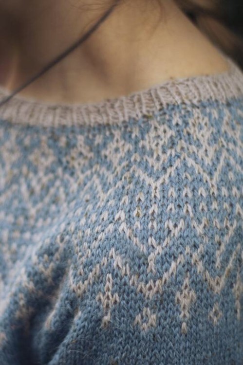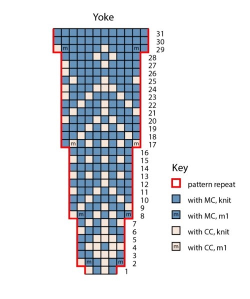 giro 2: Passare il s d’inizio,* dir fino al s del motivo, lav il motivo sulle 23 m, passare il s, *rip un’altra volta, dir fino al s d’inizio.( passando i s dei raglan quando li incontrate senza fare gli aumenti ).