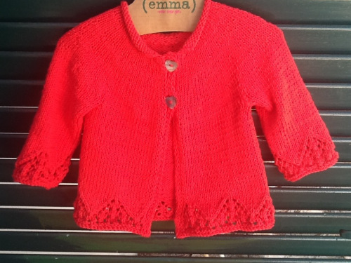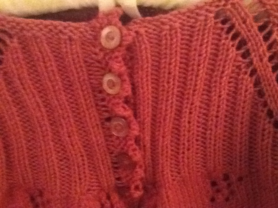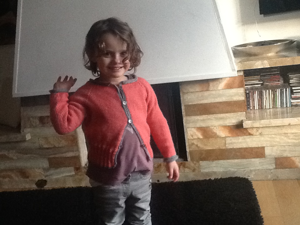 La “bellissima” con uno degli ultimi lavori fatti dalla nonna: un cardigan corallo con il collettino e i polsi “rulottati”,grigi, da fare in lana o in cotone.