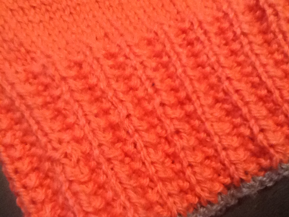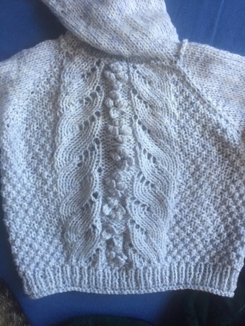 Ho proseguito a p riso doppio sui davanti,con le prime e ultime 4 m a legaccio e facendo un’asola sul davanti sin ( a ds se femmina):2 dir,1 gett,2 ass-) ogni 7 righe di legaccio. Ho lavorato ill dietro a p riso doppio e sulle 23 m centrali ( appena le avrete con gli aum ai raglan) il punto lavorato come da foto,