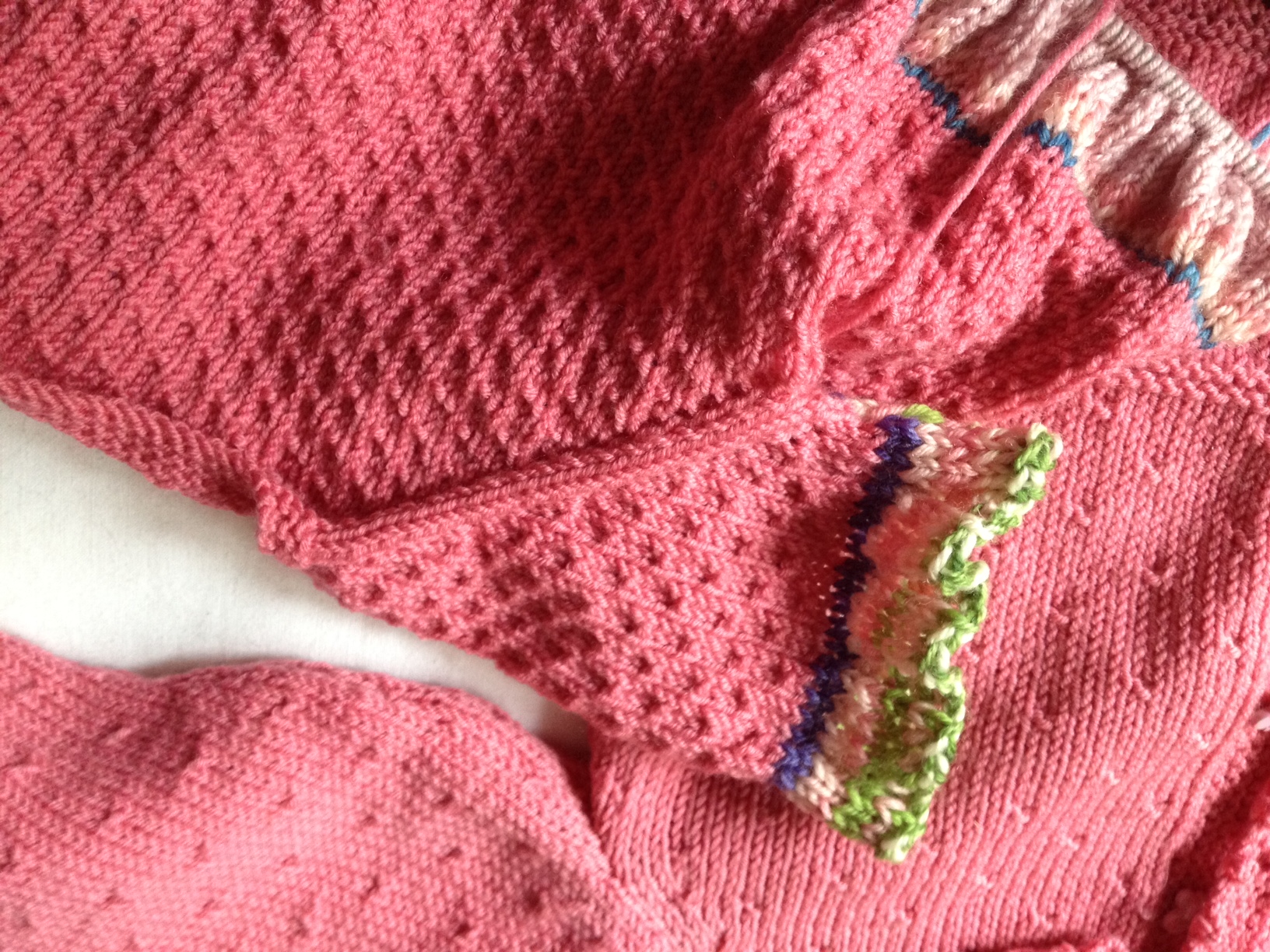 Per cui avendo solo un gomitolo di “quel”rosa che fare? ma un topdown naturalmente, che,cominciando dall’alto, ma tutt’assieme, maniche comprese, quando finisce la lana lo fa in modo..simmetrico, ad uguale livello per tutte le parti, e infatti come si può vedere dalla foto finito il gomitolo sono andata a vanti con quella tutta colorata(Knitcol di Adriafil) a cui ho tolto le parti in arancio; la lana in questione non è solo sfumata ha proprio dei metri di un colore e dei metri in altri colori, per cui..