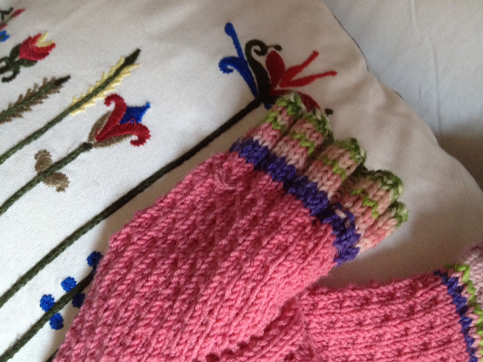 Alla fine ho “intensificato” la knit col , e ho concluso con:2 ferri di legaccio, 4 ferri a m rasata, 4 ferri di legaccio e il picot:chiudo 4m,passo a sin la m rimasta a destra, monto di seguito 2m, poi le chiudo subito assieme ad altre3,(quindi ho chiuso 5m) e vado avanti così chiudendo 5m e rimontandone 2 fino ad avere chiuso tutte le m.