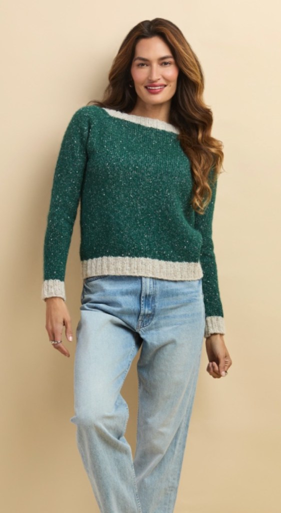 Polso Giro successivo: Con il colore di contrasto, lavorare a coste fino a quando la manica misura circa 47 cm dall’ascella. Chiudere tutte le maglie lavorando a coste .
