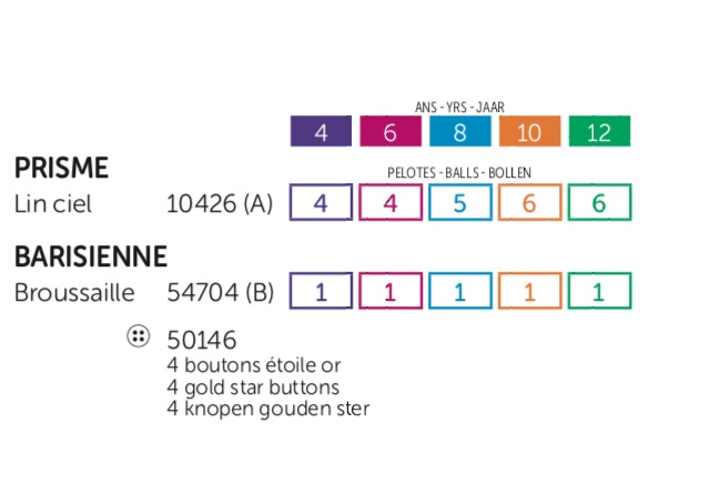 g di aumenti : 18dir, [m1, 37dir] 2 volte , [m1, 36dir] 5 volte, [m1, 37dir] 2 volte , m1, 18 dir– 10 m aumentate , 374 m in totale .