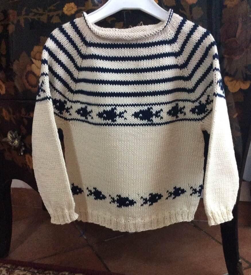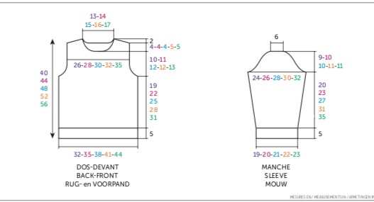Si lavora senza cuciture tutto insieme iniziando dal collo.dopo aver lavorato lo sprone , il corpo e le maniche si separano allo scalfo, e vengono lavorati separatamente. Quando si lavora lo sprone può aiutare mettere dei markers tra le ripetizioni del motivo.