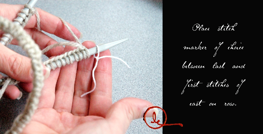 Al quarto ferro delle coste, sul rov del lavoro, mettiamo i segni, i 4 segni dello stesso colore per indicare dove faremo gli aumenti per il raglan.