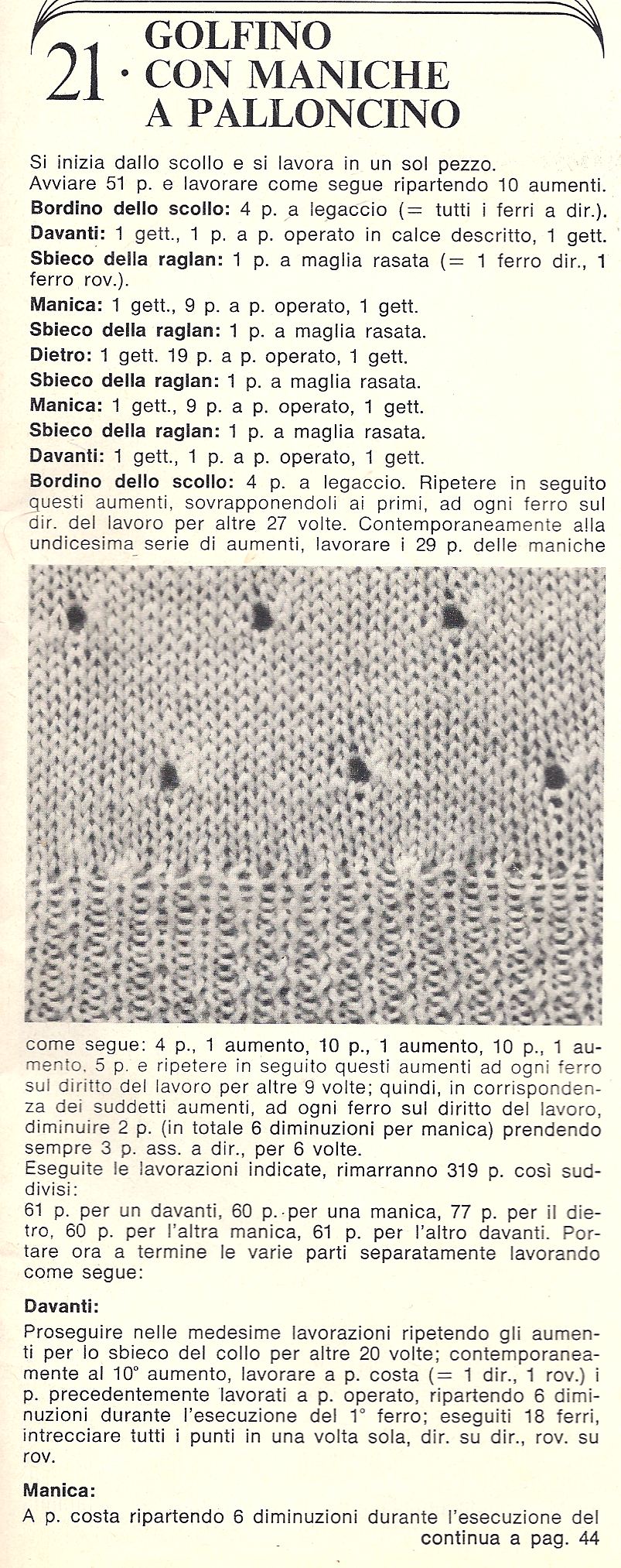 Ho avuto un “lascito”, un grande regalo, una nonna(la nonna di Camilla, la neo moglie del mio figlio più piccolo, Tommaso, sposi da dicembre), con nipoti oramai grandi e ancora nessun bis-nipote in vista , ha deciso di attaccare i ferri..al chiodo, e mi ha passato la mano, per cui mi è arrivata una notevole quantità di riviste e ferri e lana,una gioia per gli occhi; tra queste, guarda guarda, in un Mani di Fata datato 1972, ho trovato questa chicca: un topdown..:
