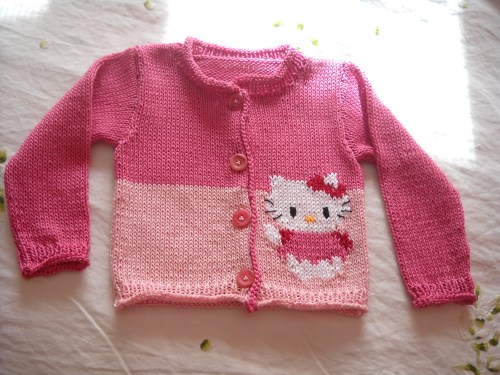 La copertina è stata realizzata utilizzando il filato volant e una fettuccia di cotone mentre il piccolo cardgan con Hello Kitty è stato realizzato riciclando una canotta scucita.