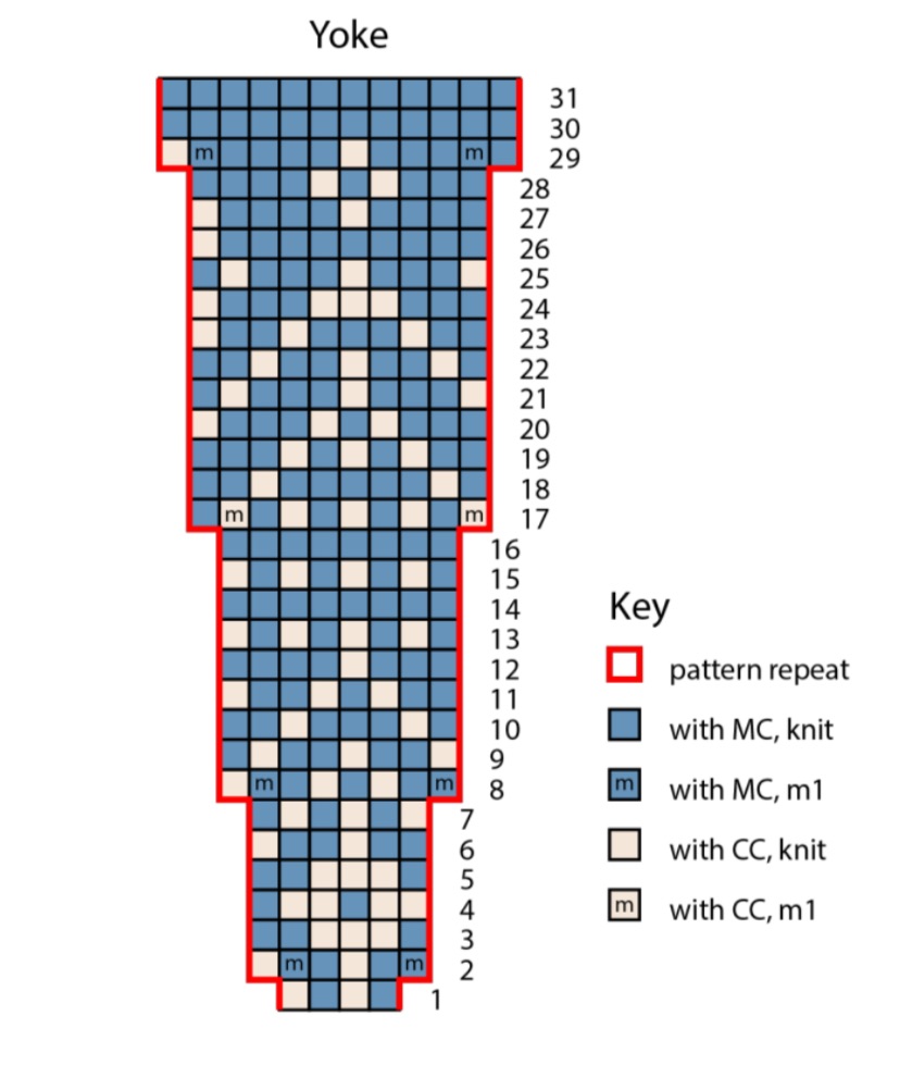 Giro 2: Lavorare il prossimo giro dello sprone fino alla fine – 48 (54, 58, 64, 68, 74, 80, 84, 88) m aumentate, 144 (162, 174, 192, 204, 222, 240, 252, 264) m. Continuare a lavorare come stabilito fino al Giro 31 dello schema – 144 (162, 174, 192, 204, 222, 240, 252, 264) m aumentate, 288 (324, 348, 384, 408, 444, 480, 504, 528) m. Cambiare con i ferri B. Tagliare CC, continuare con MC solo. Lavorare a m rasata fino a che il pezzo misura 17,5 cm (20-22-22,5-24-25-27-27-27,5) dal bordo di avvio.