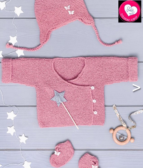 Coudre les côtés et le dessous des manches. Bordure d’encolure : autour de chaque devant, relever 44 – 48 – 52 – 56 m. puis les rab. au r. de retour à l’end. sur l’env. du tricot. Faire 3 – 3 – 4 – 4 brides sur le devant droit et coudre les boutons en visà- vis, puis faire 1 autre bride dans le haut du devant gauche pour tenir le croisement. Coudre le bouton à l’intérieur.