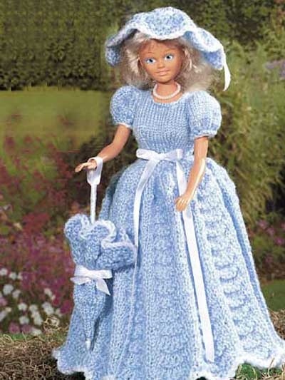 Outfit is completed in this order: knit bodice, then pick up sts at armhole for sleeve. Sew bodice side seams and sleeves at underarm. For slip, start at scallop hem, then dec to hips. Attach slip to bottom of bodice, then attach skirt. To complete cos tume, knit bonnet and parasol.