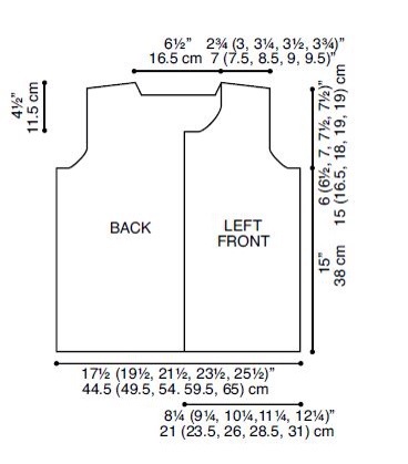 Continuare a lav a m rasata fino a 11,5 (11,5) 12,5 (13) cm (circa. 28 (28) 32 (32) ferri). Il dietro risulterà un po’ più corto rispetto al davanti.
