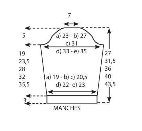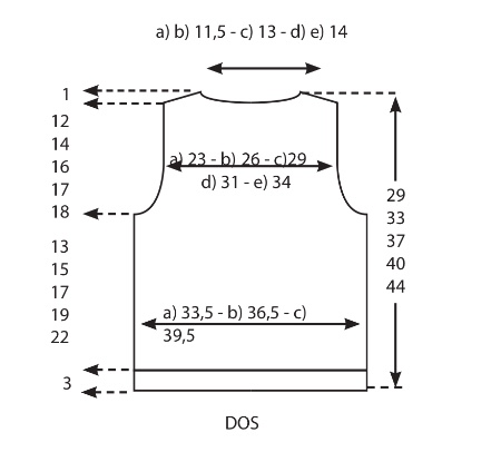 A a) 28 cm – b) 32 cm – c) 36 cm – d) 39 cm – e) 43 cm totali, firmare la spalla chiudendo dal lato dello scalfo ogni 2 ferri