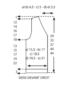 A a) 18 cm – b) 22 cm – c) 25 cm – d) 28 cm – e) 32 cm . tot.., formare lo scollo chiudendo a ds 1 x 1 m. poi: a) b) *ogni 4 ferri :2x1m.e dopo 2 ferri:1x1m.*;rip da *à*2 volte in tot.