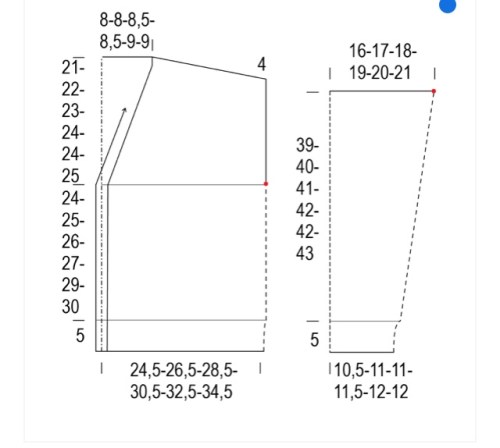 Rip il f di aumenti ad ogni ferro sul dir del lav per altre 10 volte , poi ogni 4 ferri per 3 (3, 0, 0, 0, 0, 0, 0, 0, 0) volte ,poi ad ogni ferro sul dir del lav per altre 7 (10, 18, 20, 22, 23, 26, 28) volte —221 (245, 285, 301, 321, 331, 357, 375, 393, 413) m [24 (27, 32, 34, 36, 37, 40, 42, 44, 46) m per ogni davanti ; 47 (53, 63, 67, 71, 73, 79, 83, 87, 91) m per ogni manica ; 79 (85, 95, 99, 107, 111, 119, 125, 131, 139) m per il dietro .
