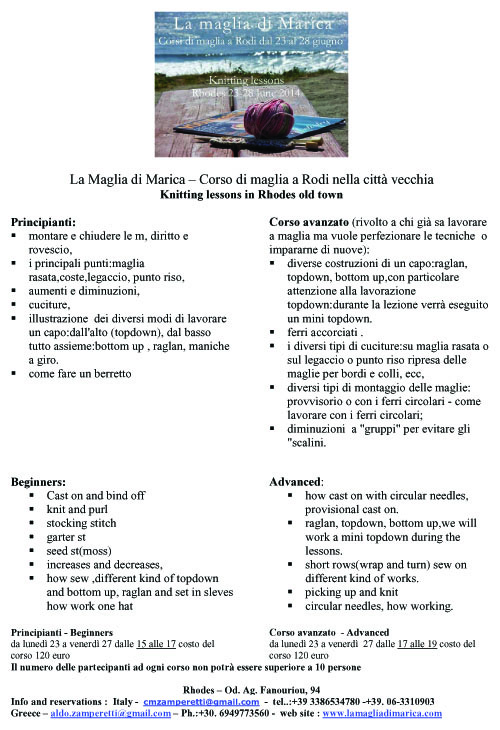 2: questo corso è per chi ha frequentato il primo corso o per chi conosce le tecniche basilari della maglia e vuole approfondire: dopo un ripasso delle tecniche fondamentali ,si faranno approfondimenti sulle tecniche di base e altri argomenti come: i diversi modi di montare le maglie, i diversi tipi di bordi, i volant, picot ecc;