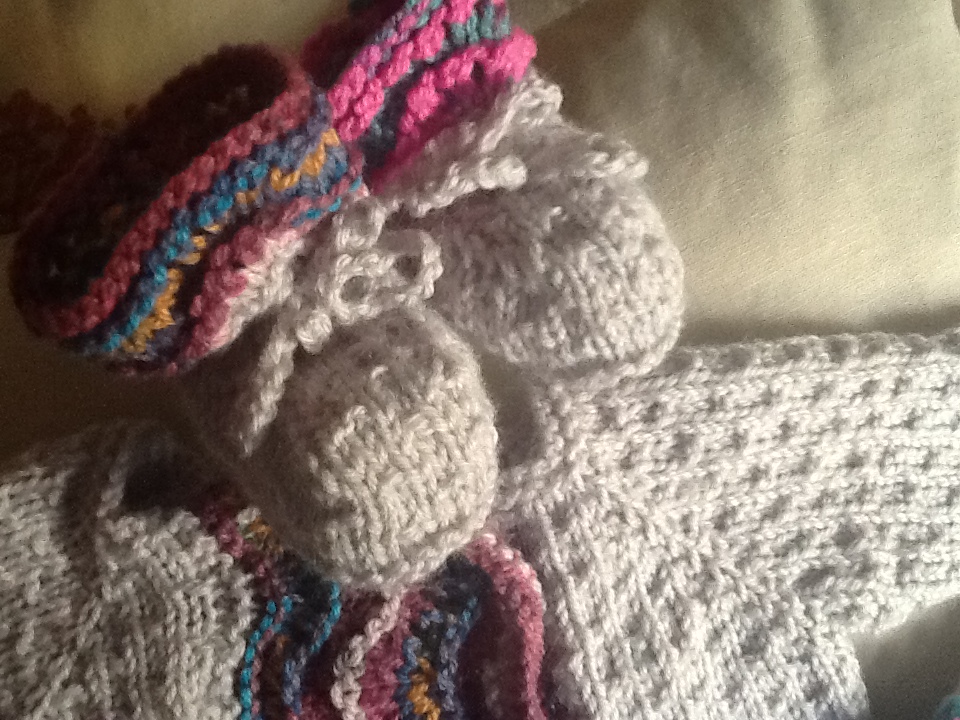 Penso di fare cosa gradita a mamme e nonne ; un completo con coprifasce, scarpine cuffia guantini e copertina; tutti con questo punto conchiglia; il coprifasce si lavora con la mia tecnica preferita: topdown cioè iniziando dal collo e tutto assieme senza cuciture.