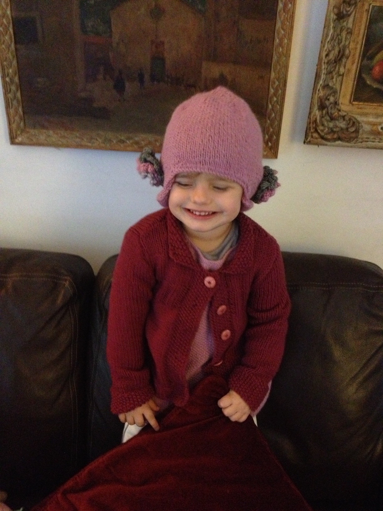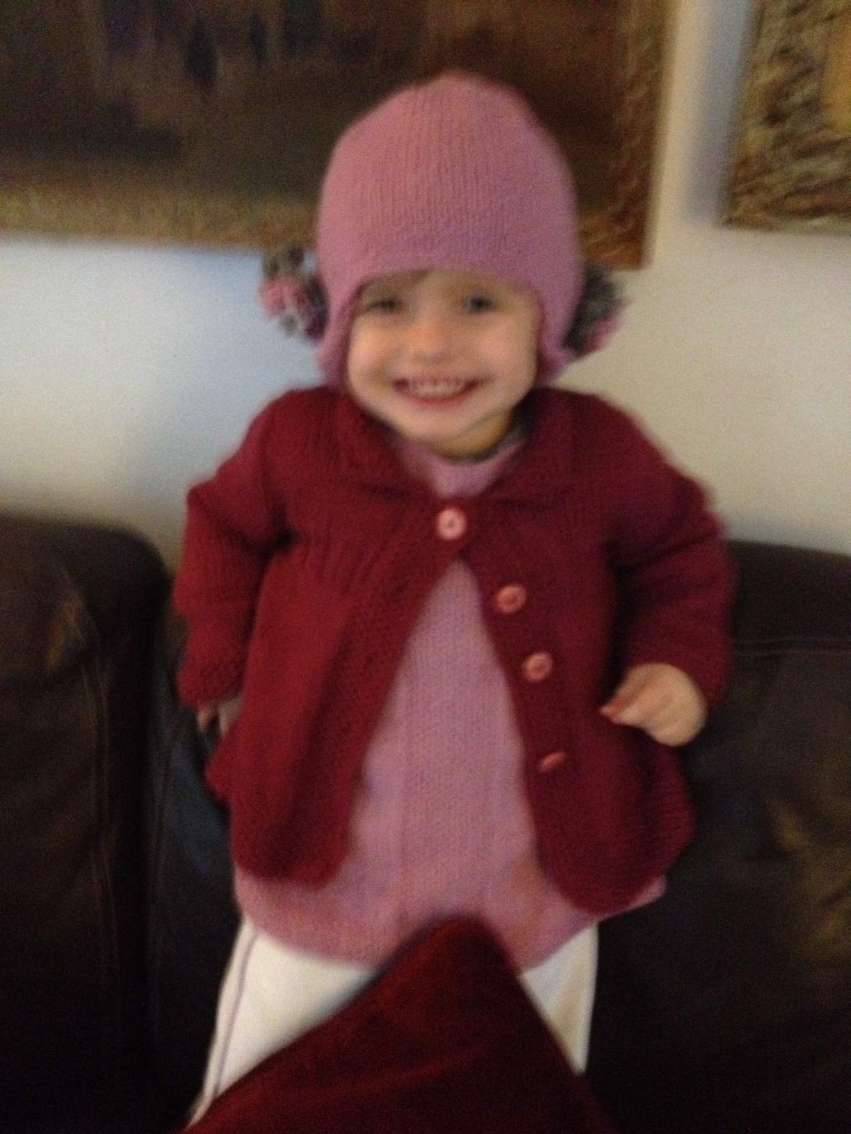 Berretto peruviano e fiori a tre corolle rosa e due toni di grigio ,sulle orecchie.