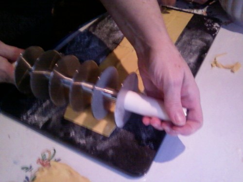 Quello che vedrete sarà questo particolare mattarello a lame per tagliare la striscia di sfoglia prima in verticale e poi in orizzontale, fer fare i quadretti perfetti che andranno riempiti e che si compra qui:”rullo tagliasfoglia” da Elettrocenter-Monteveglio Bologna(sono nel web hanno un sito con il n di telefono, se chiamate vi dicono come fare per comperarlo)