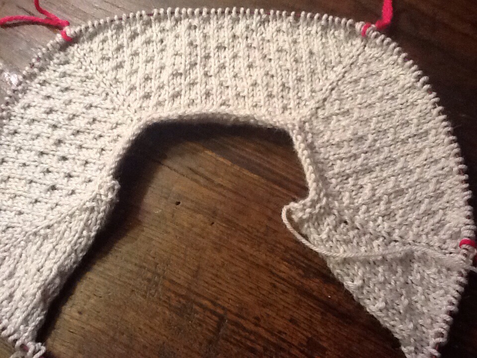 Ho trovato dei video di you tube che mostrano proprio un piccolo cardigan topdow; sono stati messi i segnapunti dopo le m del davanti, dopo la prima manica, dopo il dietro e l’ultimo dopo la seconda manica; lavoreremo 2 volte ogni m prima e dopo ogni segnaputo, 8m a ferro: